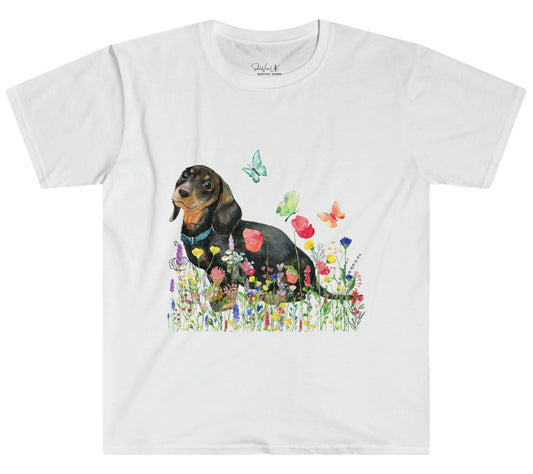 Cute "Dachshund,Wildflowers, Butterflies" Soft T-Shirt, perfect gift for Dog Loving Mom, Dog Papa, Dog Breeder - dog dad, dog papa, dog mama